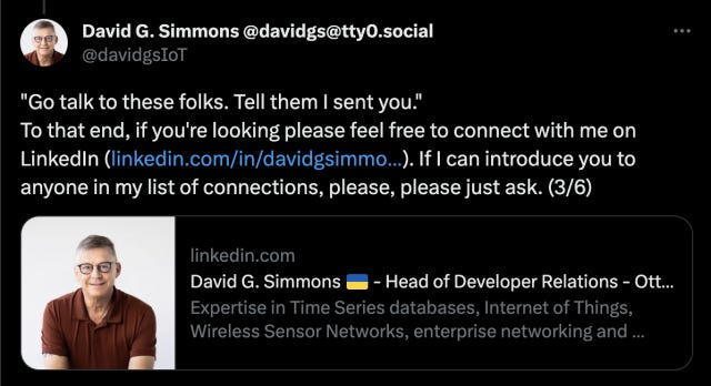 In his tweet, David G. Simmons is offering his support to other DevRel professionals looking for new jobs. He says that the DevRel community has been instrumental in helping him find new opportunities, and he wants to pay it forward by helping others. He encourages people to connect with him on LinkedIn if they are looking for new jobs, and he says that he is happy to introduce them to people in his network. He also says he is happy to pass on any cold approaches from recruiters to people looking for new jobs. See the full tweet here.
